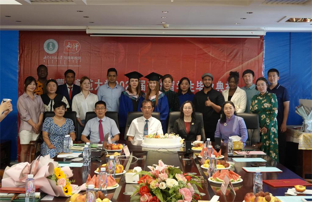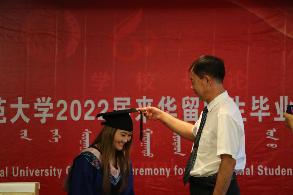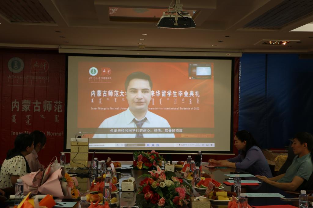 典礼上播放了学院党总支书记屈原、院长武海燕、副书记副院长白图力古尔、副院长张磊、留学生管理科科长三月、对外联络部主任哈斯朝鲁和优秀留学毕业生导师——计算机科学与技术学院副院长智敏教授、经济管理学院曹霞教授为2022届毕业生的寄语视频。在寄语中老师们向圆满完成学业的毕业生们表示热烈的祝贺,并殷切希望同学们能够从学校所学、所思、所得中汲取养分,化作行动力量,奋勇前行;希望同学们回国后能成为中外人文交流的重要使者,学以致用,为推动构建人类命运共同体做出自己应有的贡献。