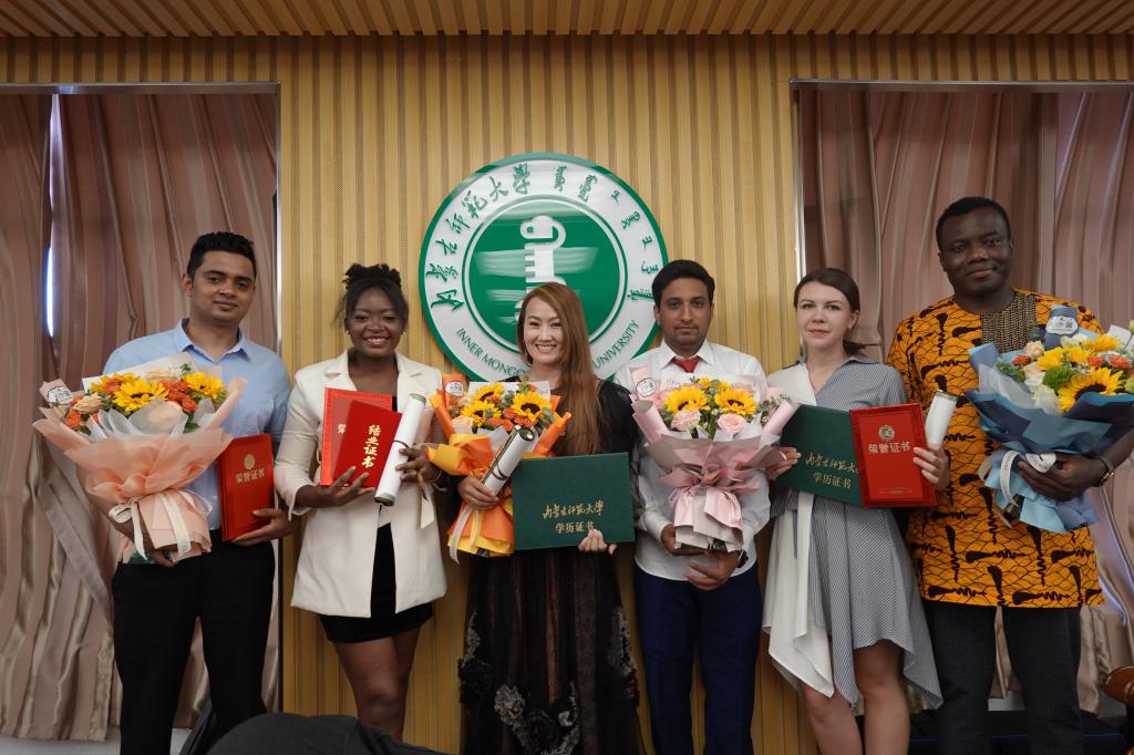 学院党总支副书记副院长白图力古尔宣读《关于参加教育部留学基金委主办的“感受中国新时代”征文、摄影、短视频优秀学生的表彰决定》和《关于参加内蒙古自治区第八届“我和中国的故事”国际学生汉语征文比赛优秀学生的表彰决定》,教师代表哈斯朝鲁、徐剑、索婷、敖楠老师为获奖留学生代表颁发荣誉证书。