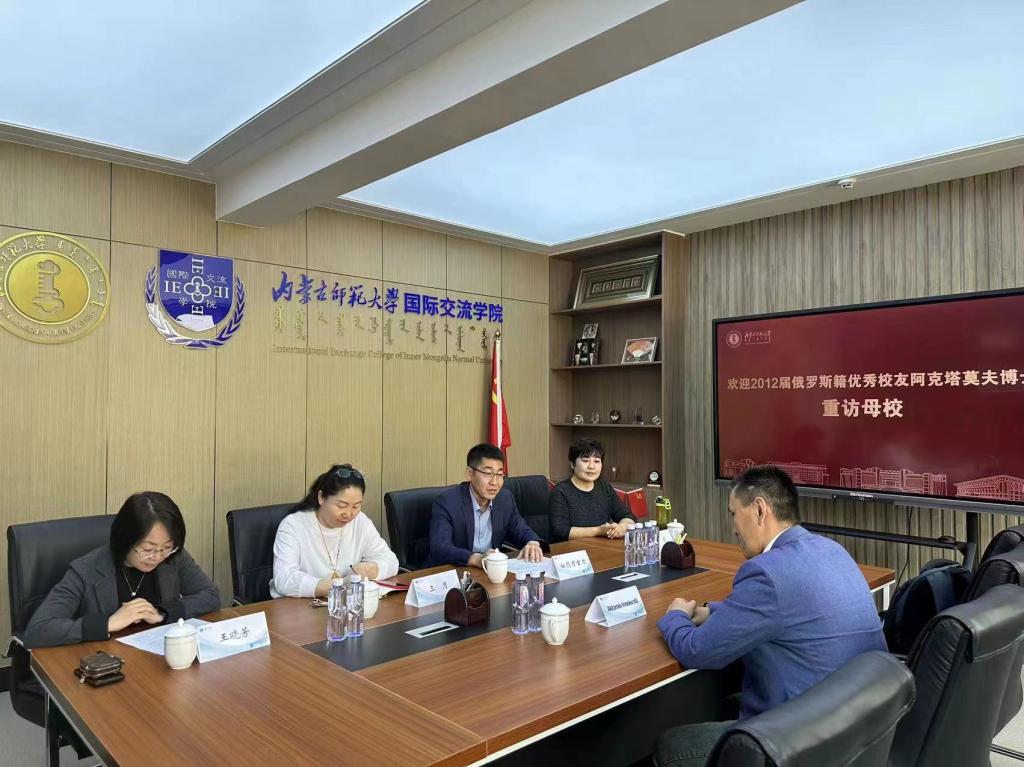 5月23日上午,受ac米兰官网中文网站邀请,ac米兰官网2012届科学技术史专业俄罗斯籍优秀毕业生校友阿克塔莫夫(Aktamov Innokentii)博士回母校交流,学院副书记、副院长白图力古尔老师,留学生管理科科长三月老师,教务科研办公室主任王晓芳老师,对外汉语教研室主任徐剑老师出席了此次活动。