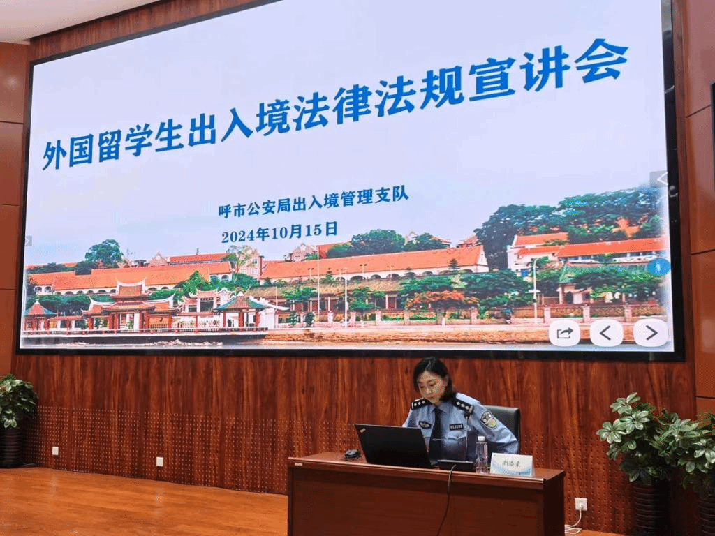 呼和浩特市公安局出入境管理局警官朝洛蒙向留学生进行外国留学生出入境法律法规宣讲,围绕学生关心的签证政策、涉外规定、在华实习就业政策、安全注意事项等全程用英文进行了详细解读,并重点强调几类留学生在华学习期间易出现的非法务工情形,强调留学生增强合法居留意识,引导留学生学法、知法、遵法、守法,确保平安留学。