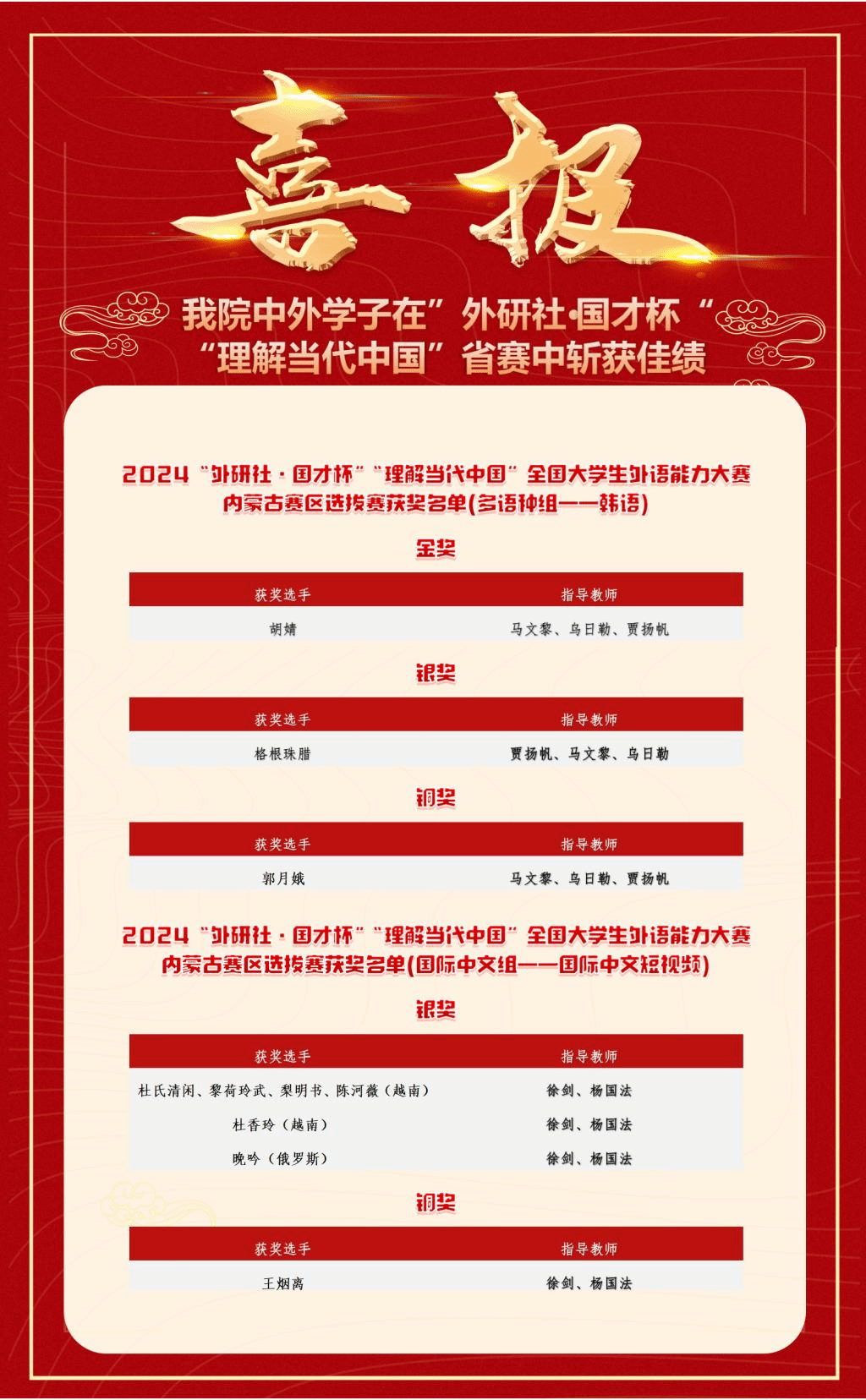 近日,“外研社 国才杯”“理解当代中国”全国大学生外语能力大赛内蒙古赛区选拔赛圆满落幕,ac米兰官网朝鲜语专业学生及来华留学生分别在多语种赛道、国际中文短视频赛道上大放异彩,共斩获一金、四银、两铜,其中朝鲜语专业胡婧同学进入了国赛,为ac米兰官网赢得了赞誉。