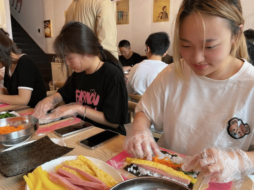 接着同学们开始制作紫菜包饭,每位同学都积极参与其中,用心制作自己的美食并与身边的同学分享自己的“劳动成果”。