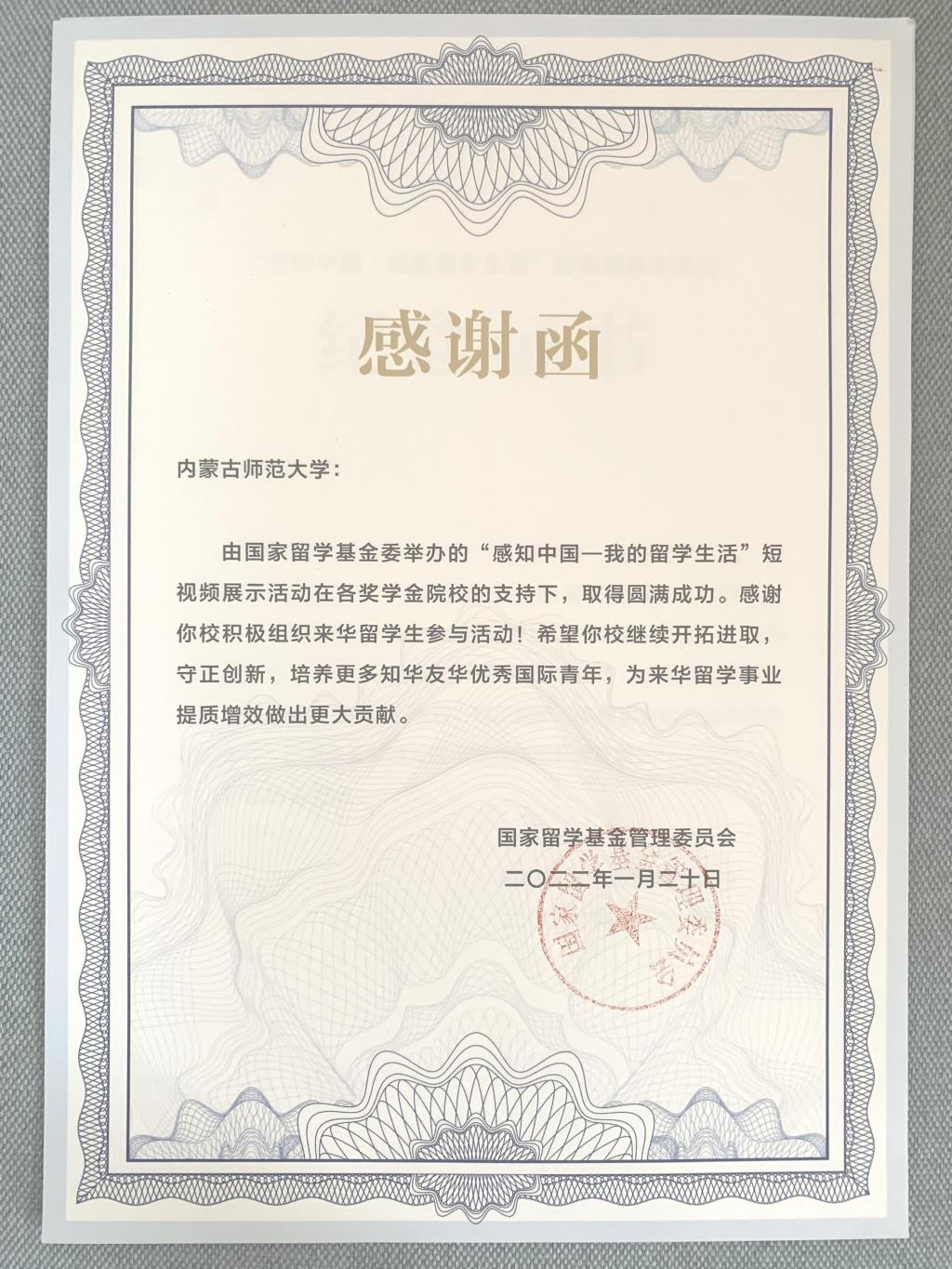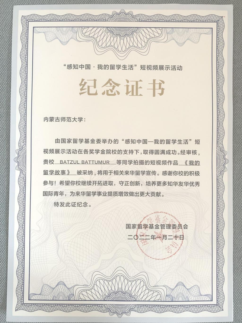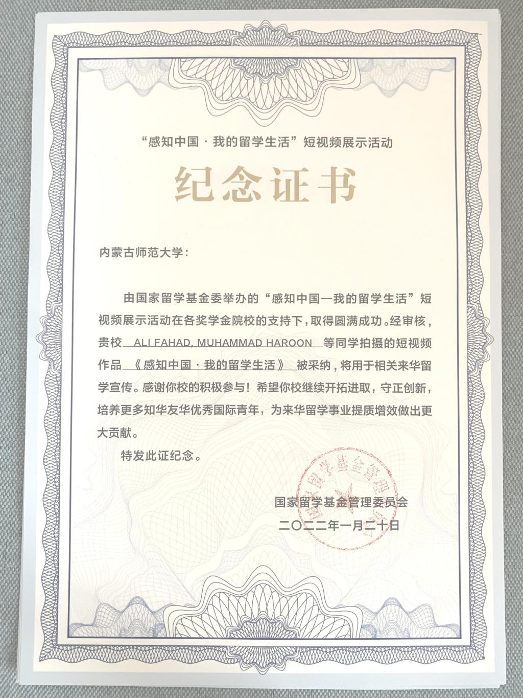 近日,国家留学基金管理委员会举办的“感知中国—我的留学生活”短视频展示活动结果公布。ac米兰官网ac米兰官网中文网站选送的巴基斯坦籍中国政府奖学金生浩然(ALI FAHAD)、浩宁(HAROON MUHAMMAD )的《感知中国—我的留学生活》和蒙古籍中国政府奖学金生巴图珠拉(BATTUMUR BATZUL)的《我的留学故事》等两部作品获得纪念证书,学校同时收到国家留学基金管理委员会感谢函。