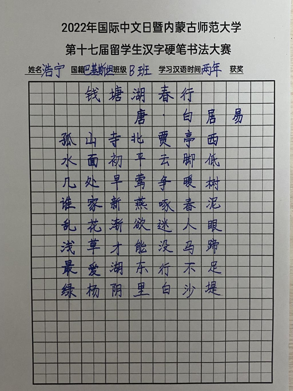 来自巴基斯坦的浩宁学习汉语短短两年,硬笔书法长进不小,一首楷书《钱塘湖春行》可圈可点。