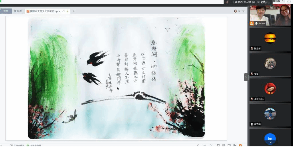 直播体验课上老师带领留学生一起朗诵欣赏了《春游湖》,还带着大家一起画出了春游湖的美景。为了增强体验课的可操作性,老师们没有使用专业的国画工具和材料,而是用生活中随处可见的小工具吸管儿、牙刷、棉签和一些颜料让同学们绘制出一幅幅各具特色的专属春景。