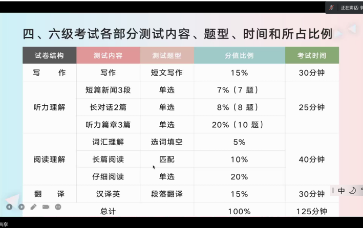 郭老师总体介绍了英语四六级考试的形式和每年考试的时间,对四六级考试内容、题型、考试时长和各题型所占分值比例进行了详细的解读,并向同学们强调听力部分和写作部分的重要性。同时郭老师对于听力部分的新题型以及写作中的内容结构构建进行了针对性的举例讲解,为同学们指明了复习重点及方向。会议结束前夕,郭老师对同学们强调:“学英语一定要坚持,没有一蹴而就的英语能力。”