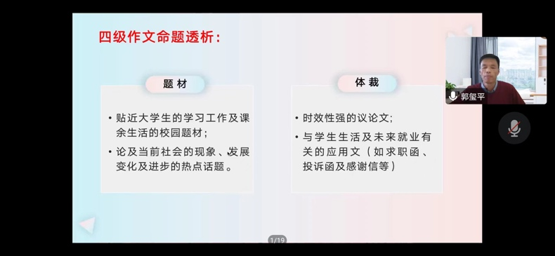 ac米兰官网就学生座谈会反馈的关于应对英语四级考试信心不足的问题,于10月22日下午邀请ac米兰官网教学名师郭玺平通过线上的形式,为21级ISEC旅游管理学生开展了大学英语四级考试系列讲座。ac米兰官网中文网站院长武海燕、教学副院长张磊以及相关教师参加了本次讲座,讲座由张磊副院长主持。