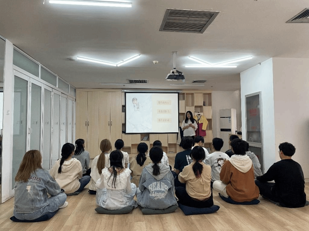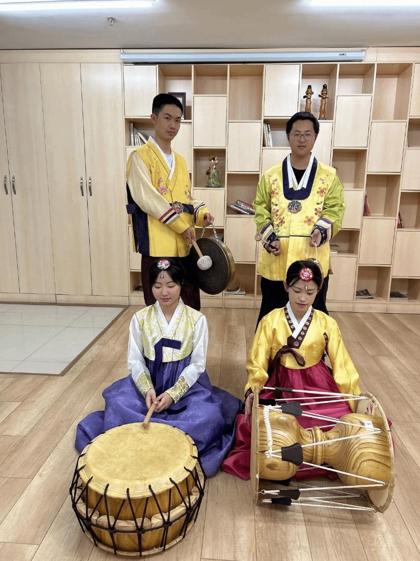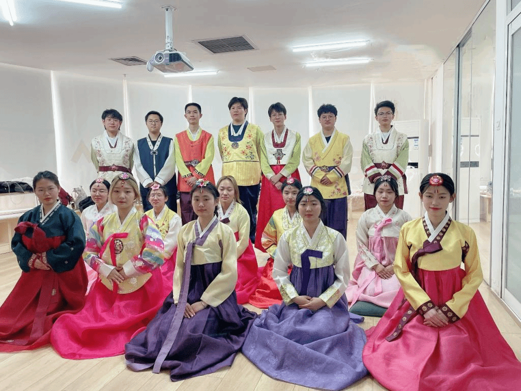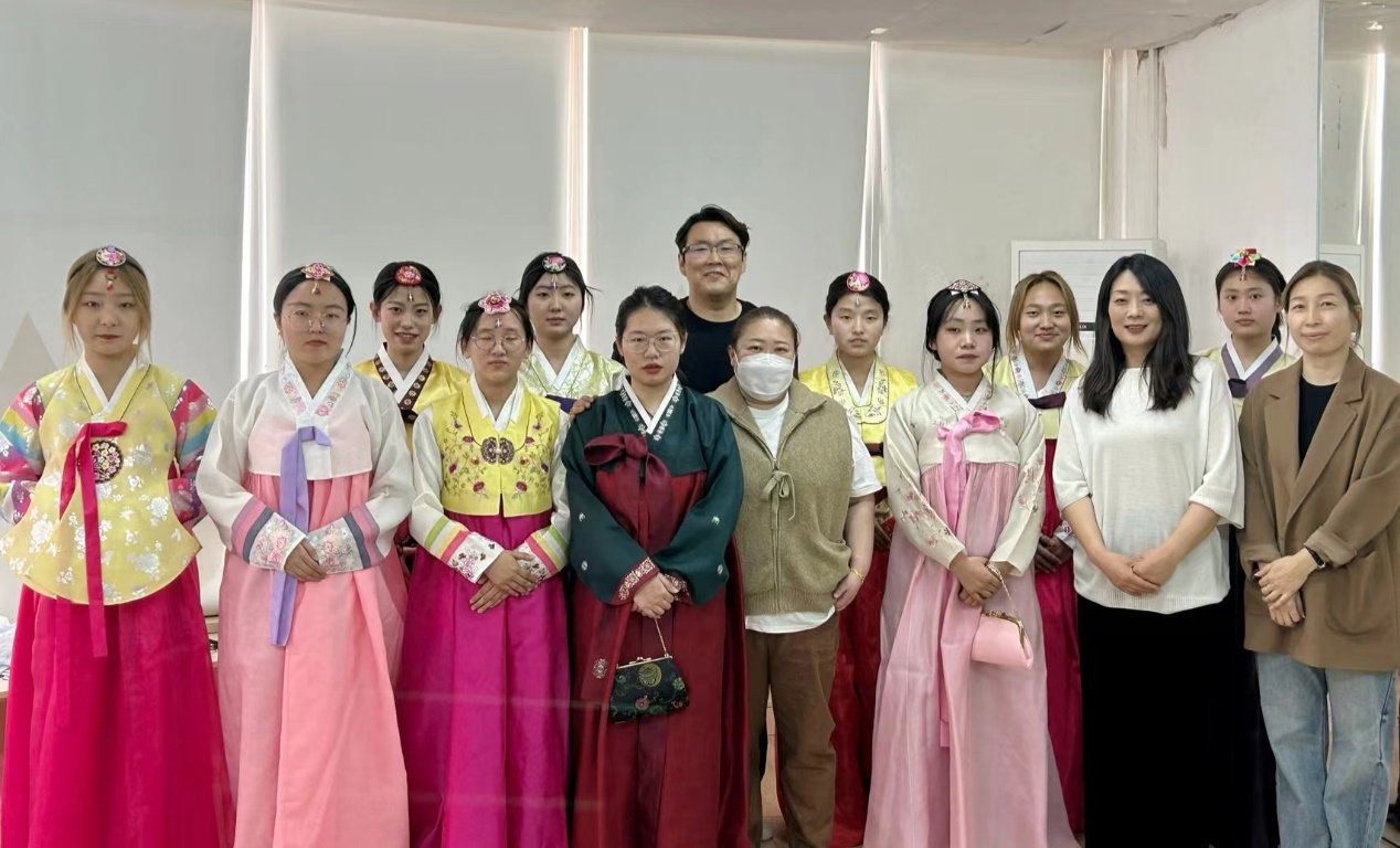 4月17日下午,ac米兰官网中文网站韩国语系教师和2022级学生一起来到韩国文化体验室,在马文黎老师的详细介绍下,了解了韩服的历史、特点及穿着方法。学生们试穿韩服,试戴头饰,学习怎样行韩国礼。