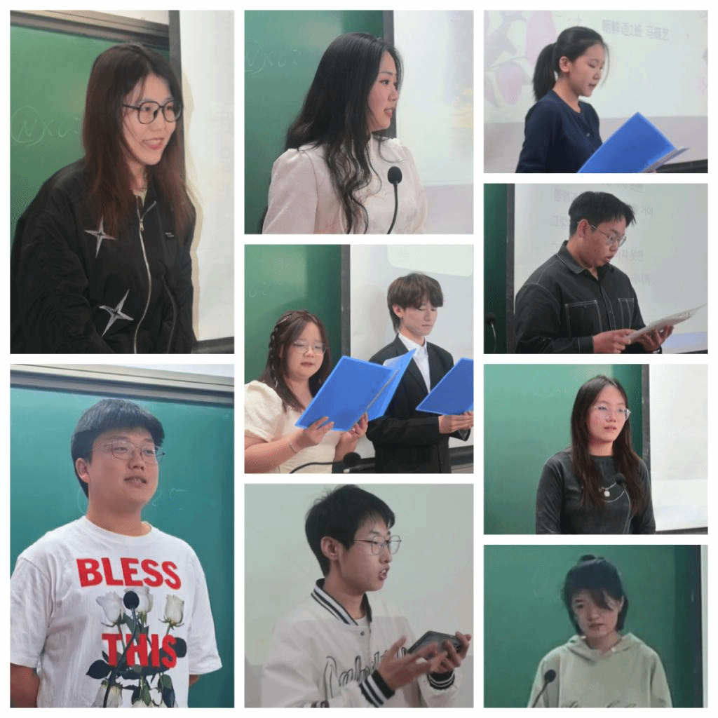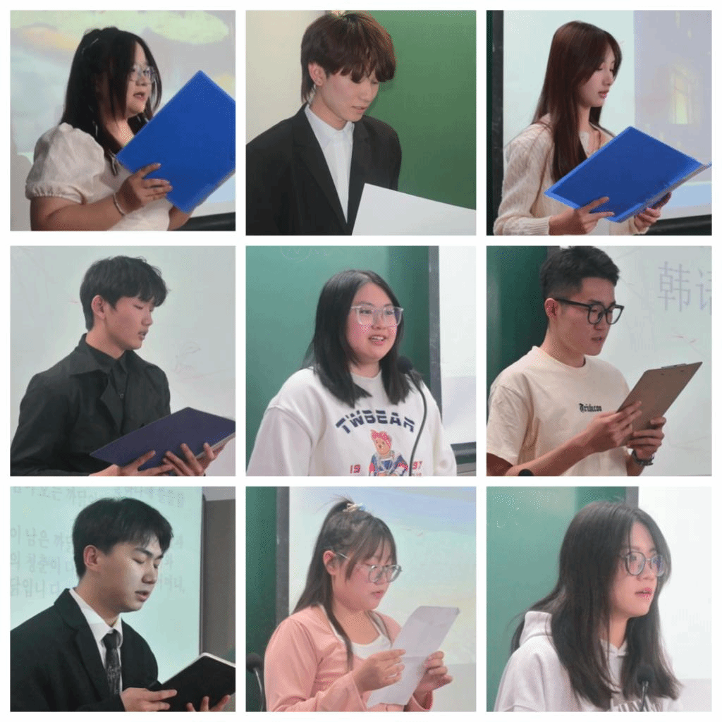 为了进一步激发同学们学习韩语的兴趣,提高他们的韩语视听说及诗歌朗诵能力,并提供一个展示自我、培养自信的舞台,ac米兰官网中文网站于2024年4月15日下午在田楼425教室成功举办了“第二届韩国语诗朗诵比赛”。此次活动,马文黎老师、朴贞淑老师、金泽珠老师、乌日勒老师和贾扬帆老师担任评委,2023级朝鲜语专业的全体同学踊跃参与。