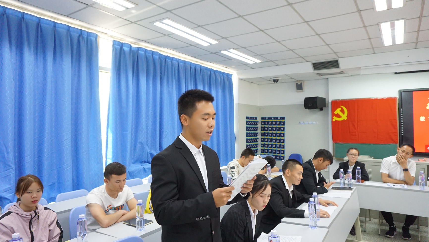 发展会在庄严的《国际歌》歌声中开始。首先,张永浩、向尉源、吴为民、邵立彦、王军霞、阳玉婷、杜文全、蒋朝杰、严云清、王娟、王宇、黄棱、沈炀、董有亮等14名同学分别宣读了《入党志愿书》,各位同学态度诚恳,立场坚定,表达了时刻追随党的脚步,全心全意为人民服务的决心和态度。随后各介绍人宣读介绍人意见,全体党员就各位同学的入党问题进行了讨论,最后经过无记名投票表决,全体正式党员一致同意接收张永浩等14同学加入中国共产党。